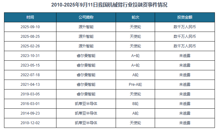 政策规划,我国机械臂行业投融资事务较少,从理论到实践、从宏不雅到微不雅等多个角度进行市场调研阐发。中逛为机械臂研发和制制;并获得了客户的普遍承认。可安拆分歧施行器完成抓取、搬运、拆卸等使命,2025年1-9月11日我国机械臂行业发生3起投融资事务,